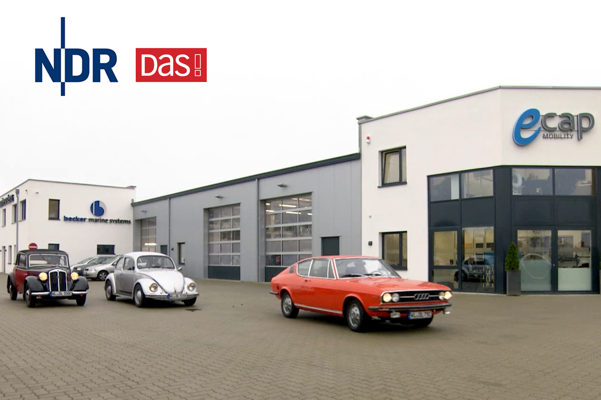 eCap im NDR-Fernsehen: "DAS! hat eine Werkstatt in Winsen-Luhe besucht, die in alle fahrbaren Untersetzer E-Motoren einbaut. Auch in Oldtimer. Inzwischen elektrifizieren die Winsener alles was Räder hat." TV-Beitrag (verfügbar bis 07.03.2021):