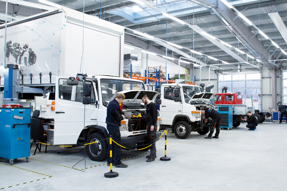 Unsere zwei Fertigungshallen bieten eine Produktionsfläche von 1.500 m² mit 600 m² Bürofläche. An zehn Hebebühnen und einer Freifläche für Großprojekte schließen sich Schlosserei, Elektrofertigung, Montagewerkstatt und Lackiererei an.