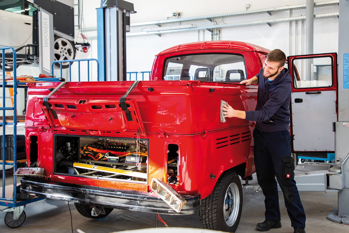 The battery capacity of 21 kWh requested by the customer allows a range of approx. 100 km. With the associated 9 kW charger, the charging time for the Bulli is less than three hours.